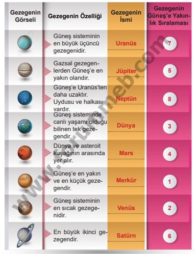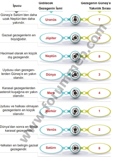 Soru : Aşağıda gezegenlere ilişkin bazı ipuçları verilmiştir. Bu ipuçları değerlendirilerek uzay mekikleri, ilgili gezegenlere gönderilecektir. Buna göre uzay mekiklerinin gideceği gezegenlerin isimlerini ve Güneş’e yakınlık sıralarını ilgili bölümlere yazınız.