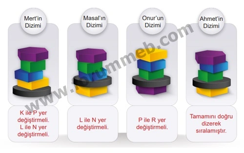 Öğretmen öğrencilerinden gök cisimlerini temsil eden geometrik şekilleri, Güneş’e yakınlıklarına göre bir zemine üst üste dizmelerini istemiştir. Öğrenciler, zemine Güneş’e en yakın gezegenden başlayarak geometrik şekilleri dizecektir.