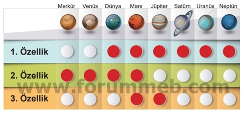 Aşağıda gezegenlere ait bazı özellikler verilmiştir. Tabloda gösterilen gezegenlerden bu özelliklere sahip olanların kutusu boyanacaktır. Etkinliğin sonunda üç özelliği de içeren gezegen belirlenecektir.