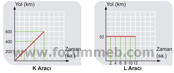 Aynı anda K aracı A şehrinden, L aracı ise B şehrinden birbirine doğru harekete geçmiştir. Aynı yol güzergâhını kullanarak L aracı A şehrine, K aracı da B şehrine ulaşmıştır. Araçların hareketleri ile ilgili aşağıdaki grafikler verilmiştir. K aracının hareketini altı saatte tamamladığı bilinmektedir.