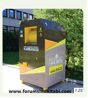 Ülkemizde birçok belediyenin giysi kumbarası (Görsel 1.23) uygulaması bulunmaktadır. İnsanlar kullanmadıkları kıyafet, ayakkabı ve tekstil ürünlerini giysi kumbaralarına bırakmaktadır. Belediye çalışanları belirli aralıklarla kumbaralarda biriken ürünleri alarak ayrıştırma merkezine götürmektedir. Burada kullanılabilir olan ürünler, gerekli temizlikleri yapılarak ihtiyaç sahiplerine ulaştırılmaktadır.