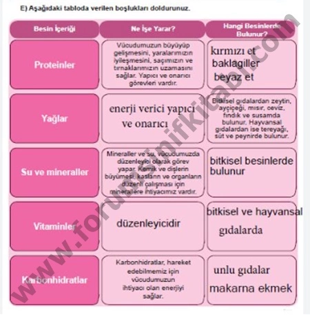 4. Sınıf Fen Bilimleri Kitabı Canlı Yaşamı ve Besin İçerikleri Metni Etkinlik Cevapları